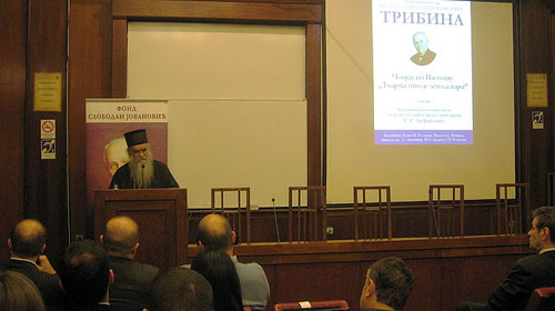 amfilohije-mitropolit-200Фонд Слободан Јовановић је 25. новембра 2013. године у Коларчевом народном универзитету одржао трибину под називом „Човјек по Његошу `тварца што је земља вара`“. На трибини је говорио Архиепископ цетињски и митрополит црногорско-приморски Амфилохије.