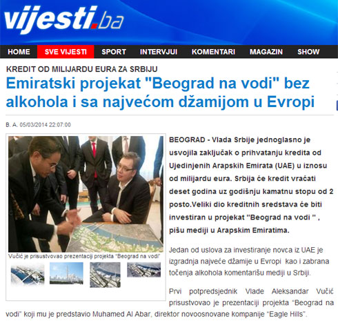 Jedan od uslova za investiranje novca iz UAE je izgradnja najveće džamije u Evropi kao i zabrana točenja alkohola komentarišu mediji u Srbiji.