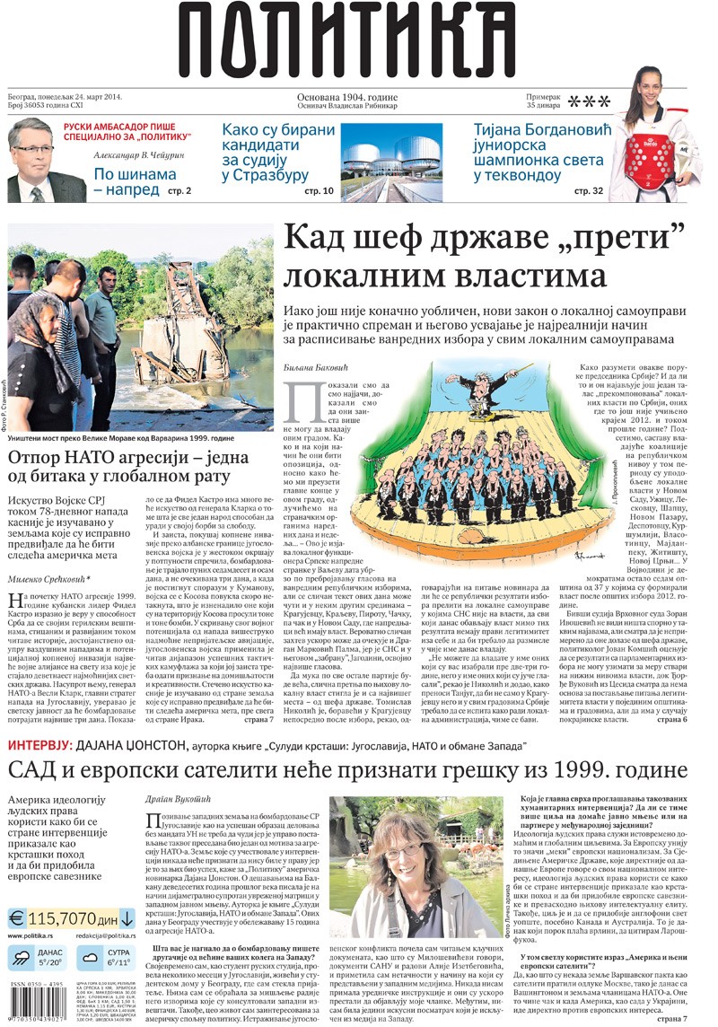 У два чланка, најстарији српски лист на насловној страни обележава НАТО бомбардовање: ОТПОР НАТО АГРЕСИЈИ – ЈЕДНА ОД БИТАКА У ГЛОБАЛНОМ РАТУ и САД И ЕВРОПСКИ САТЕЛИТИ НЕЋЕ ПРИЗНАТИ ГРЕШКУ ИЗ 1999. Дакле, разбијено је јединство (читај: једноумље), али ће НАТО „партнери“ да нам прогледају овде кроз прсте кад су могли да нам опросте што су нас бомбардовали!