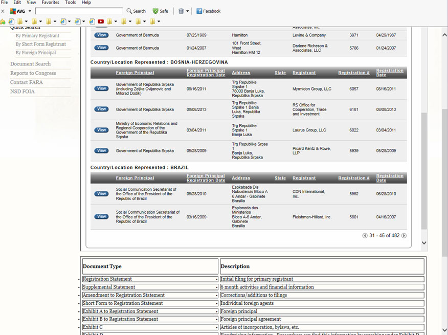 На интернет презентацији FARA, која је доступна свима, види се да је регистровано свега четири предузећа која у Вашингтону лобирају за Републику Српску.