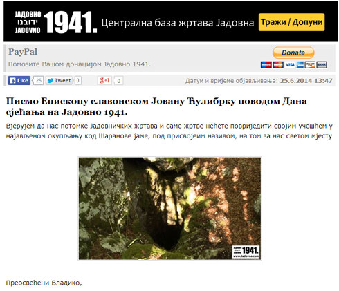 Вјерујем да нас потомке Јадовничких жртава и саме жртве нећете повриједити својим учешћем у најављеном окупљању код Шаранове јаме, под присвојеим називом, на том за нас светом мјесту