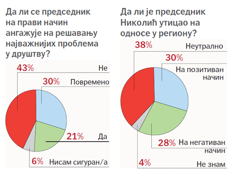 Оно како су наши саговорници оценили резултате овог истраживања када је реч о председнику Николићу можда се може сажети Пејићевим ставом – није сјајно, али није баш ни катастрофално. Мишљење да ли је укупан скор позитиван или негативан, каже Пејић, зависи од тога како се гледа или како ко жели да схвати. Највише испитаника је рекло да није задовољно радом председника (45 процената), али када се „помешају” они који су задовољни и делимично задовољни (укупно 46 процената), то опет не испада тако лоше.