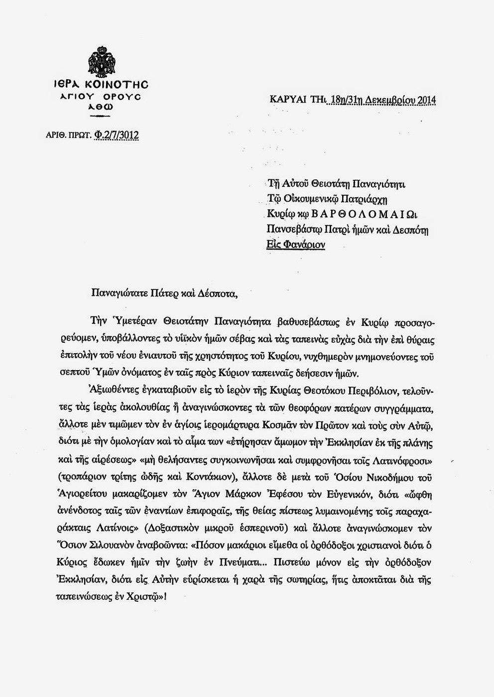 Москва, 6. фебруар, 2015. – До уредника сајта АгионОрос.ру дошао је текст поруке Киноније (свештене општине) Свете Горе Атонске патријарху Вартоломеју, преноси угледни сајт Православие.ру. Писмо је посвећено посјети папе Цариграду у новембру 2014. године, написано је у децембру, али је јавности тек сада доступан текст. Још нема пуног превода на руски језик.