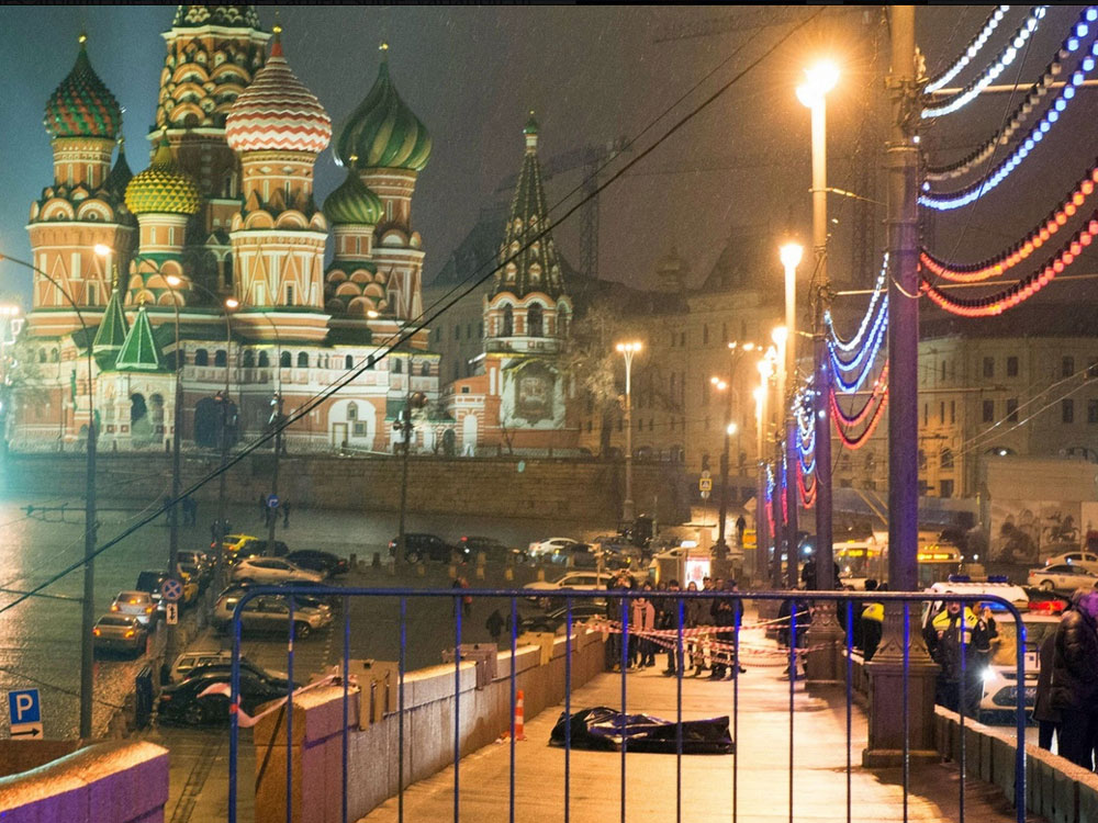 Прим. СС: На фотографији Немцов лежи мртав, право пред Кремљом – тако да и најглупљи на Западу добију жељену „поруку“, чак и да им њу није сервирало хиљаде самоуверених гласова… (Кликните на слику за увећање)