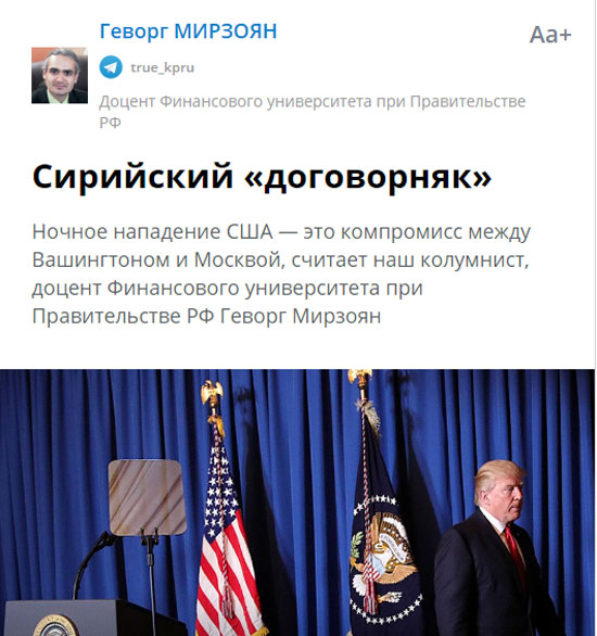 Да је све урађено у договору са Русијом сведочи то што Москва „није приметила“ америчке ракете, није их обарала, нити напала америчку ракетну крстарицу. А постојао је и споразум са Сиријцима, јер су 59 крилатих ракета (у вредности од преко 100 милиона долара) причиниле минималну штету, пише Мирзојан.