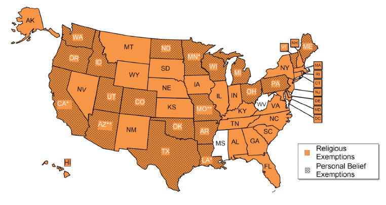 Не треба да чуди што су (годишње) цифре оболевања од МБ најбрже расле у савезним државама са најлабавијим правилима за давање изузећа од вакцинисања. Све, осим двеју држава (Масачусетс и Западна Вирџинија), дозвољавају верска изузећа, а 19 од њих, укључујући и Калифорнију, омогућава родитељима да одбију вакцинацију своје деце из личних разлога или због философских гледишта. Многи од тих родитеља кажу да сумњају у ефикасност вакцинације, или да су забринути да би вакцинација могла изазвати аутизам или друге озбиљне здравствене проблеме, мада не постоје медицински докази који подржавају такве теорије.