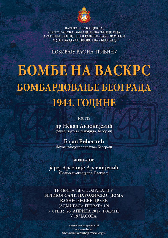 Позивамо вас, да у среду, 26. априла 2017. године, у 19 часова, у великој сали парохијског дома Вазнесењске цркве (Адмирала Гепрата 19) присуствујете трибини на тему „Бомбе на Васкрс: бомбардовање Београда 1944. године“.