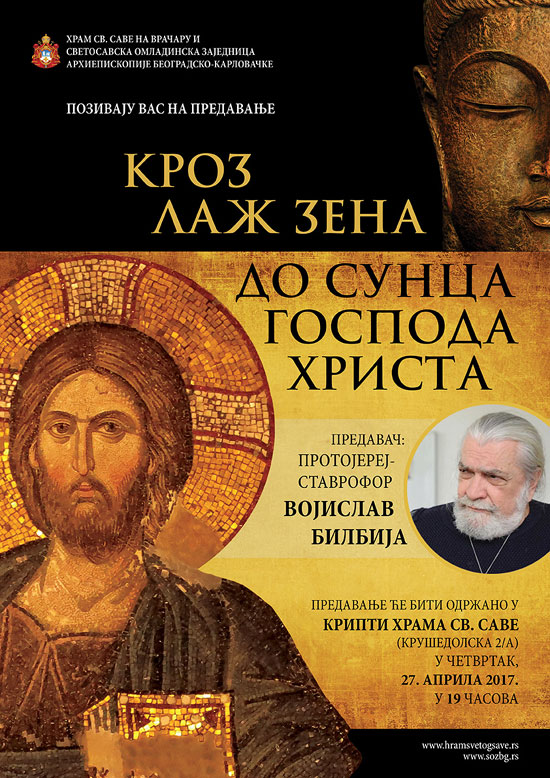 Позивамо вас, да у четвртак, 27. априла 2017. године, у 19 часова, у крипти Храма Св. Саве на Врачару (Крушедолска 2/А), присуствујете предавању на тему „Кроз лаж зена до сунца Господа Христа“.