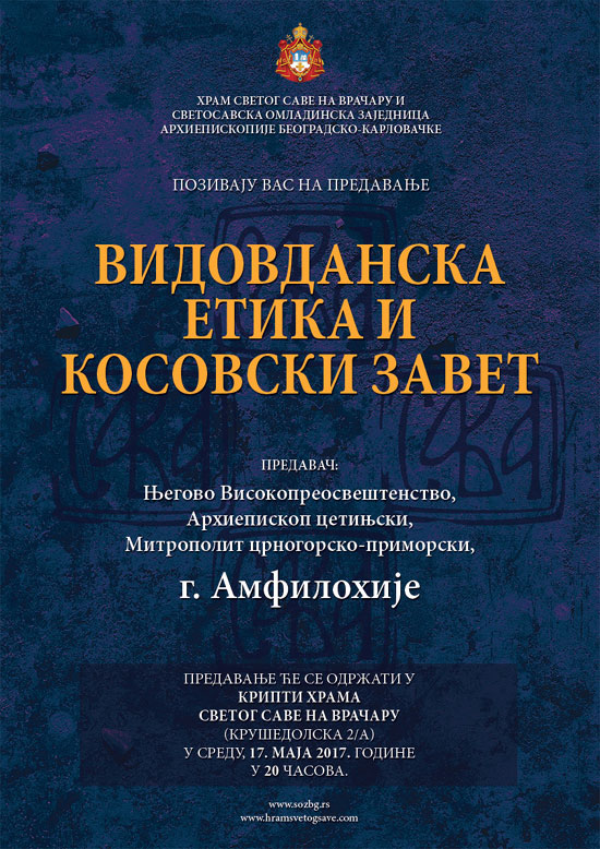 Позивамо вас, да у среду, 17. маја 2017. године, у 20 часова, у крипти Храма Св. Саве (Крушедолска 2/А) присуствујете предавању на тему „Видовданска етика и Косовски завет“.