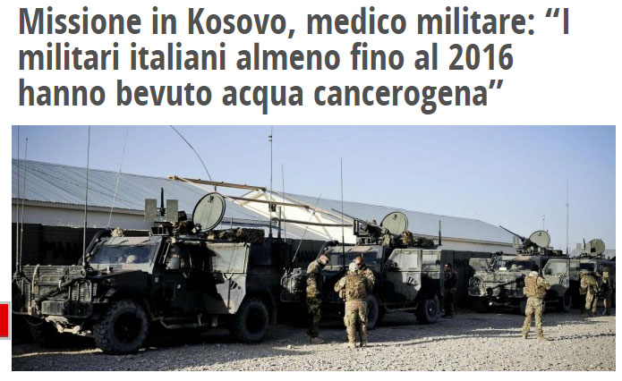 Италијански контингент у мисији на Косову је пио, барем до 2016, канцерогену воду. Барем је тако пријавио војни лекар Енио Летијери, током саслушања пред парламентарном истражном комисијом која испитује последице употребе осиромашеног уранијума. Жалба потпуковника не оставља простор за сумњу: „Вода анализирана 2015, па све до 2016. године, садржи бромат, чија је канцерогеност класе 2Б, у износу од 65/97 микрограма по литру, у поређењу са границом која се толерише од 10.“ Класа у коју спада бромат „окупља могуће канцерогене супстанце, за укупно 285 супстанци“, наводи се на сајту AIRC (Associazione Italiana per la Ricerca sul Cancro – Италијанско удружење за истраживање рака).