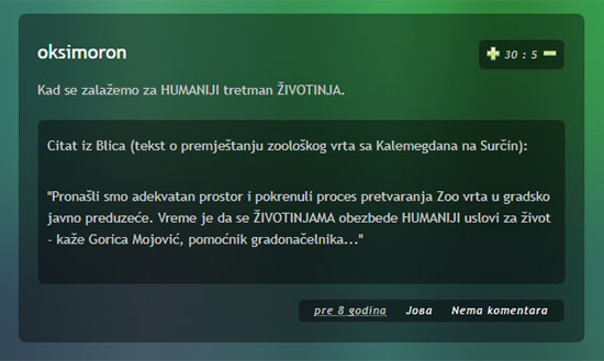 И, наравно, Горица Мојовић ће, том приликом, са ЕU висина оценити да је заштита ћирилице и афирмација плурализма српске културе „десничарска оријентација“. На (полу)шаљивом сајту „Вукајлија“ као пример језичке фигуре „оксиморон“ (овде) наведена је госпођина изјава, из доба када је још била градски функционер, да је „време да се животињама обезбеде хуманији услови за живот“ (овде).