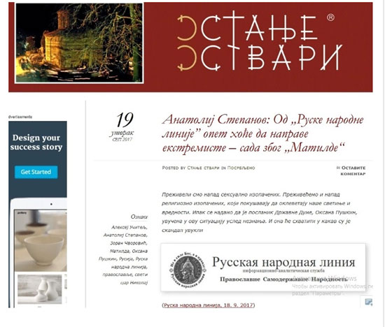 Сербский информационно-аналитический ресурс Стање ствари (Положение вещей или Состояние дел) опубликовал материалы, посвящённые новому повороту в скандале вокруг «Матильды»: «Посланик Оксана Пушкин затражила да се због екстремизма испита православни сајт „Руска народна линија“»(«Депутат Оксана Пушкина попросила проверить на экстремизм православный сайт „Русская народная линия„»), а также «Од „Руске народне линије“ опет хоће да направе екстремисте – сада због „Матилде“», представляющую собою перевод нашей статьи «Нас опять хотят сделать экстремистами».
