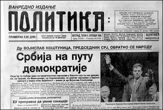 Петог октобра 2000. године су тајне службе и друге агентуре Атлантске империје помоћу коалиције озлојеђених осветника Осме сједнице ЦК СКС, ускраћених деветомартоваца и за ту сврху специјално обучене уличне гериле, успјеле да замијене режим Слободана Милошевића режимом ДОС-а.