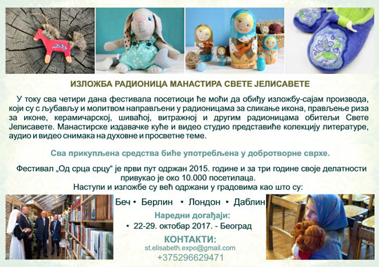 За све време трајања сајма радиће продајна изложба производа који су с молитвом и љубављу направљени у манастирским радионицама: иконописној, радионици за прављење риза за иконе, керамичарској, кројачкој, радионици за рад са каменом, аудио и видео студију, као и многим другим. Многобројни производи издавачке куће манастира Свете Јелисавете, једне од најбољих у Белорусији, заузимаће централно место на изложби-сајму. Сестре милосрђа и монахиње воде бригу о неколико дечјих домова, болница, интерната, диспанзера за туберкулозу, два уточишта за бескућнике. Сва прикупљена средства биће утрошена за дела милосрђа.