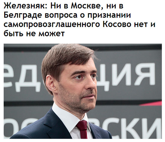 «Однако пока еще сохранилось определенное недопонимание этого процесса в некоторых общественных кругах в самой Сербии. Тех, кто в недоброжелательном окружении борется за права косовских сербов, изображают в качестве соглашателей и пособников возглавляющих самопровозглашенное Косово военных преступников и террористов. Кое-кто даже пытается дискредитировать взаимоотношения Партии «Единая Россия» и Сербской прогрессивной партии, публикуя откровенную ложь. Авторы этих фальшивок, прежде всего, подрывают доверие к тем СМИ, в которых публикуются подобные материалы. Хотел бы еще раз отметить, что ни в Москве, ни в Белграде вопроса о признании самопровозглашенного Косово нет и быть не может», – резюмировал Железняк.