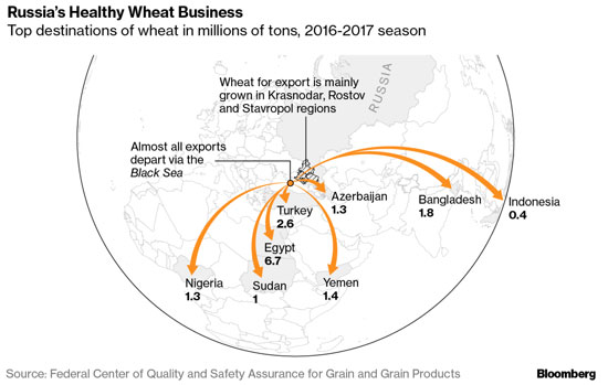 Неки од највећих купаца нису далеко од Русије – на Блиском истоку и у Северној Африци, али за руску пшеницу заинтересоване су и удаљене земље као Мексико и Индонезија. Главни купац је Египат, који зависи од руске пшенице како би прехранио своје грађане. За њим долази Турска, која купљену пшеницу меље у брашно и затим извози.
