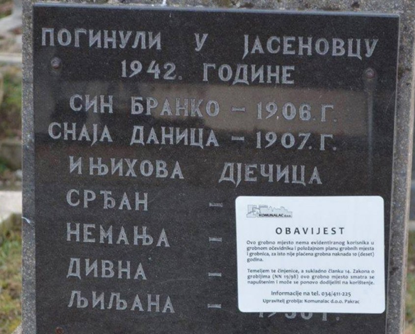 Родитељи који су 1942. године изгубили на неком од стратишта у Јасеновцу сина Бранка (1906) и снају Даницу (1907) и њихову дечицу Срђана, Немању, Дивну и Љиљану, подигли су мали споменик на српском сеоском гробљу исписан ћириличним словима. Из разумљивих разлога, медији који су објавили фотографију споменика не наводе презиме породице нити место. У овом тексту то и није толико ни битно. Битан је садржај текста на папирнатом обавештењу које је залепљено на камену. Не бих да га преписујем, већ препоручујем да га погледате на интернету под насловом „Хрвати уклањају трагове и сведоке усташког геноцида“.