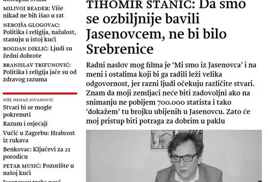 Ових дана пажњу ми је привукао интервју глумца Тихомира Станића под насловом „Da smo se ozbiljnije bavili Jasenovcem, ne bi bilo Srebrenice“ објављен у загребачким „Novostima“ 9, фебруара 2018, стр, 22-23. (то је гласило Српског националног вијећа). Не желим да коментаришем садржај његове жалопојке на тему зашто нико нема разумевања за његов сценарио о Јасеновцу. Истичем само реченицу: „Да смо се раније озбиљније бавили Јасеновцем, верујем да не би било ни Сребренице ни других места злочина из ратова 1990-их.“ Може ми се приговорити да издвајам само једну реченицу из ширег контекста! Но, он за мене није толико битан. Битно је поређење два догађаја која се ни по чему не могу поредити! Чини ми се да би сваки мој покушај да то објасним представљало губљење времена јер то Станић и њему слични не би разумели. Стога његову тврдњу остављам њему и ономе ко је с њим правио интервју.