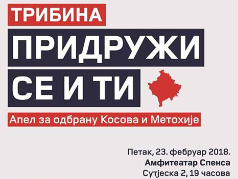 У петак, 23. фебруара у 19 часова, амфитеатар на СПЕНСУ (Сутјеска 2, Нови Сад) трибина „Придружи се и ти Апелу за одбрану Косова и Метохије“.