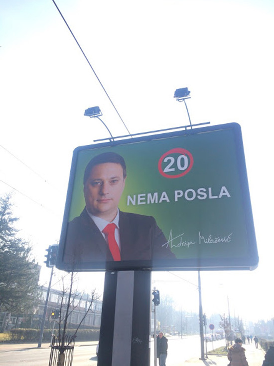 У актуелну кампању за београдске изборе опет се укључио један познати комичар, овог пута преко серије билборда са следећим, опет препознатљиво „лажно озбиљним“ порукама: „Чувамо границу“, „За Европу и Русију“, „Продајемо домаће“, „Први на листи“, „Без лажи“. Поред ових порука и слике комичара у лажно озбиљној пози политичара у оделу и кравати, билборди нам поручују да гласамо за листу број 20, користећи често коришћен симбол заокруженог броја са гласачког листића. Комичар је овог пута Андрија Милошевић, а не лези враже, листа под редним бројем 20. је опет НОПО! Као носилац листе овог већ помало заборављеног покрета овај пут се појављује Алекса Вујовић, који најављује да ће ова странка, уколико буде дошла на власт, „усмртити све псе луталице“. Шаљиво, зар не?