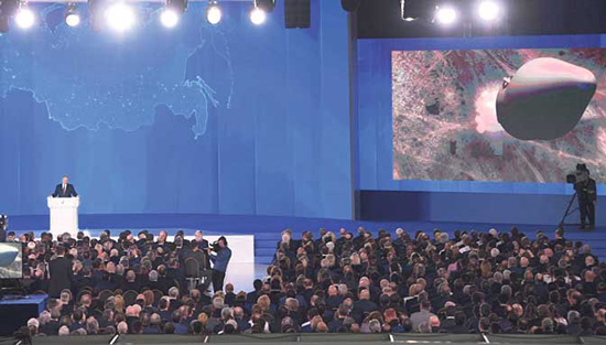 Пуштене су компјутерске анимације подводних нуклеарних дронова који уништавају бродове и приобалске градове, нова генерација интерконтиненталних балистичких ракета (сармат), малих нуклеарних бојевих глава и ласерског оружја.
