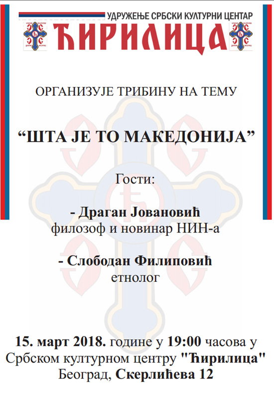 У СКЦ „Ћирилица“ 15. марта 2018. године у 19 часова одржава се трибина „Шта је то Македонија“.