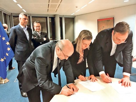 Мустафа, Вучић и Могерини потписују споразум о косовском правосуђу (Фото: ФоНет)