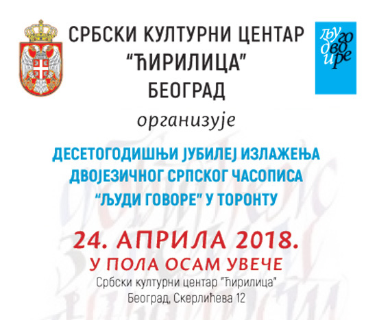 Десет година излажења двојезичног часописа „Људи говоре“ из Торонта обележиће се 24. априла у 19:30 часова у Србском културном центру „Ћирилица“ у Београду (Скерлићева 12).