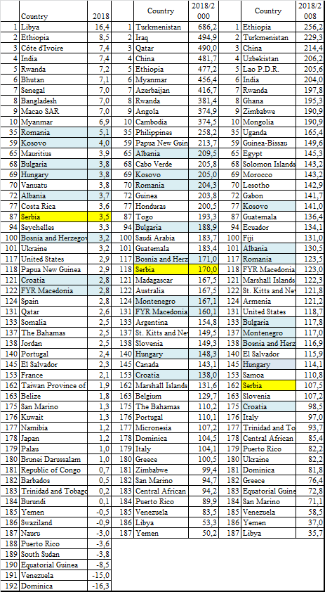 На овом месту осврнућемо се на три податка за Србију и њено место у свету: очекивани раст у 2018, раст остварен од 2000. до 2018. и раст у периоду од 2008. до 2018. године.