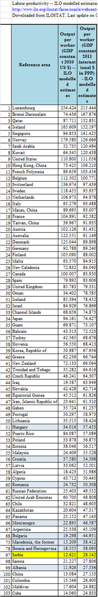 Међу 189 земаља Србија се налази на 97. месту, у „златној средини“, не штрчи ни навише ни наниже. Од земаља којима је окружена има само 2,2% већу продуктивност од Албаније која је имала за 1,4% већу продуктивност од Кине. Имала је, као и Србија, јер ће Кина у 2018. претећи обе земље.