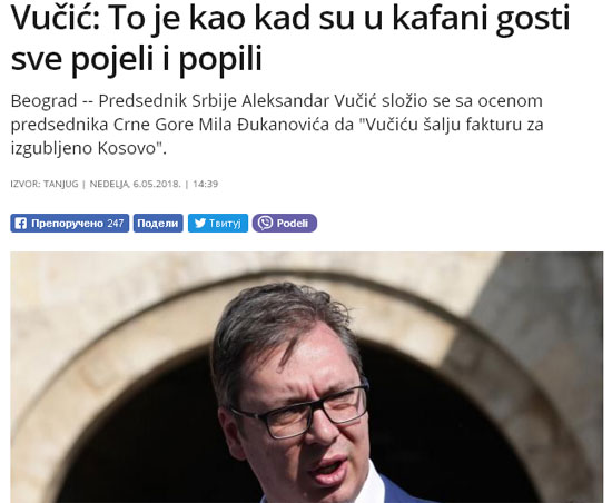 Председник Србије Александар Вучић сложио се са оценом председника Црне Горе Мила Ђукановића да „Вучићу шаљу фактуру за изгубљено Косово“.