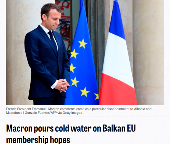 „Он је то рекао на самиту у Софији, чија идеја је била да се оснаже везе између региона и Европске уније. Макронови коментари су изазвали разочарање у Албанији и Македонији, земљама које се надају зеленом светлу за почетак преговора о чланству, после добијања начелног одобрења од Европске комисије, у априлу ове године“, наводи Политико.
