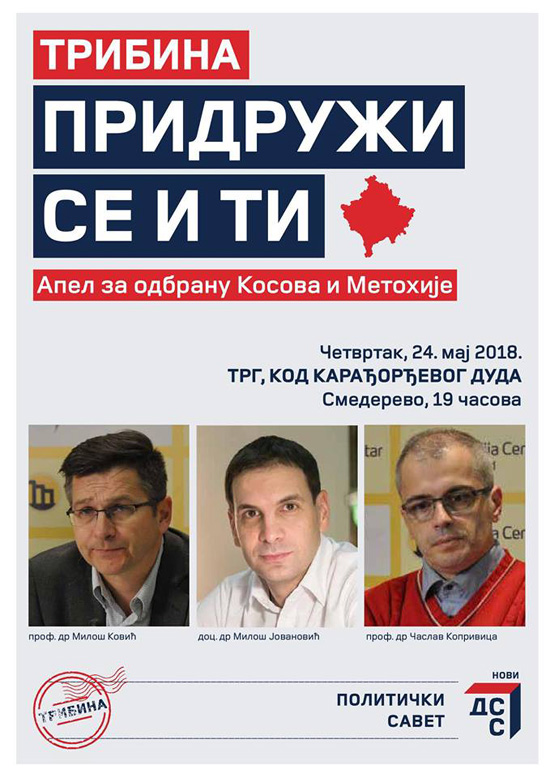 На представљању Апела за одбрану Косова и Метохије у Кикинди говорили су председник ДСС-а Милош Јовановић, некадашњи министар за КиМ Слободан Самарџић и професор Филозофског факултета у Новом Саду Срђан Шљукић