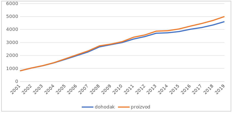 Табела коју наводи В. Глигоров: Бруто национални доходак, БНД, и бруто домаћи производ, БДП, текући динари (Извор: Ameco. Примедба: 2018. и 2019. су пројекције Европске комисије)