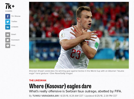 На бриселском сајту Политико објављен је текст о утакмици Србија – Швајцарска у националистичком тону, који оправдава Шаћирија и Џаку, а потезе Србије оцјењује као глупе.