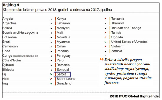 Пре месец дана објављен је извештај Међународне конференцијe синдиката о стању права запослених у свету (овде). Србија је по статусу (заправо по системском гажењу) радничких права сврстана у исти ранг са Анголом, Боцваном, Чадом, Конгом, Обалом Слоноваче, Етиопијом, Сијера Леонеом, Свазилендом, Танзанијом, Хаитијем, Ираком, Бурмом, Сенегалом, Тајландом, Угандом, Вијетнамом и Замбијом (стр. 10).
