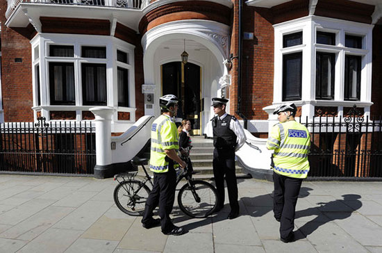 Асанж, 47-годишњи Аустралијанац, борави силом прилика у амбасади Еквадора у Лондону, откако је добио политички азил те земље. А из ње не сме ни нос да промоли, ни корак да искорачи, јер би га даноноћни британски специјални полицијски чувари, тачније хајкачи одмах ухапсили и депортовали у САД! Амбасада Еквадора је годинама практично опкољена полицијом, камерама, доушницима.
