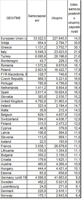 Једна вест ме је мотивисала да проверим садашње стање запослености у малом приватном сектору (самозапослени и самозапослени са радницима), и у пољопривреди, а у односу на стање у Европи. Пре неколико година сам то исто учинио и само су Чешка и Италија имале већи удео самозапослених у укупној запослености.
