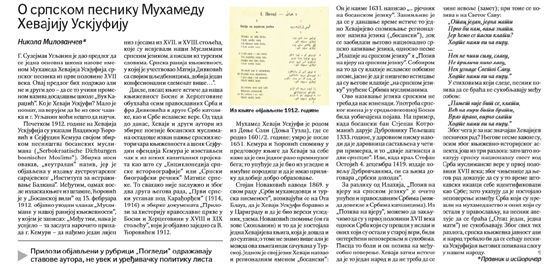 Г. Угљанин је дао предлог да се једна основна школа назове именом Мухамеда Хевајиjа Ускјуфија, српског песника из прве половине XVII века. Овај предлог бих подржао али не и други део – да се то учини променом назива досадашње школе „Вук Караџић“. Ко је Хеваји Ускјуфи? Мало је познат па верујем да ће из овог чланка и г. Угљанин моћи нешто да научи. Почетком 1912. године на Хевајија Ускјуфија су указали Владимир Ћоровић и Сејфудин Кемура својом збирком песништва босанских муслимана („Serbokroatische Dichtungen bosnischer Мoslims“). Збирка носи овакав, „неутралан“ назив, јер је објављена у издању аустро-угарског сарајевског „Института за истраживање Балкана“. Међутим, одмах после изласка књиге из штампе, Ћоровић је у „Босанској вили“ од 15. фебруара 1912. објавио уводни чланак „Муслимани у нашој ранијој књижевности“, у којем је записао: „Међу тим, нама је успјело – та заслуга нарочито припада г. Кемури – да нађемо један лијеп низ пјесама из XVII. и XVIII. стољећа, које су испјевали наши Муслимани српским језиком, а писали их турским словима. Српска ранија књижевност, у којој је учествовао Матија Дивковић са својим шљедбеницима, добија један конфесионални елеменат више…“. Дакле, писац књиге истиче да наша књижевност Босне и Херцеговине обухваћа осим православних Срба и фра Дивковића и друге Србе католике, као и Србе исламске вере. Од тада до данас, Хеваји и други аутори из збирке поезије босанских муслимана остадоше изван пажње српских историчара књижевности а шеик Сејфудин ефендија Кемура је изостављен чак и из неких капиталних пројеката као што су „Енциклопедија српске историографије“ или „Српски биографски речник“ Матице српске. То свакако није заслужио и због два друга његова рада, „Први српски устанак под Карађорђем“ (1914, 1916.) и збирке докумената „Прилози за хисторију православне цркве у Босни и Херцеговини у XVIII и XIX стољећу“, који је објавио заједно са В. Ћоровићем 1912.