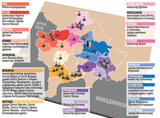 У Специјалне заштитне зоне српске баштине потпадају манастири Високи Дечани, Грачаница, Пећка патријаршија, који су под заштитом Унеска, али и други храмови и цркве у Гњилану, Штрпцу, Србици, Клини, Ораховцу…, као и средњовековни мост Војновића у Вучитрну, споменик Газиместан, тврђава Звечан, средњовековни град Ново Брдо, село Велика Хоча…