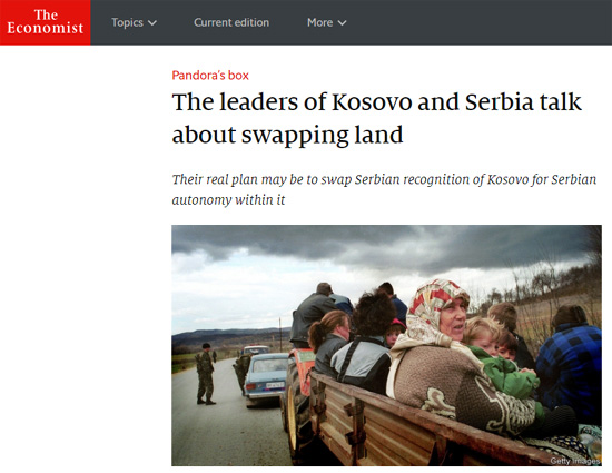 „Многи аналитичари верују да Тачи и Вучић заправо немају намеру да мењају границе, већ се припремају за договор о образовању српске аутономије унутар Косова у замену за признавање. Иако би обе стране мрзеле тај споразум, њихови лидери би макар могли рећи да су очували драгоцену територију“, навео је Економист.
