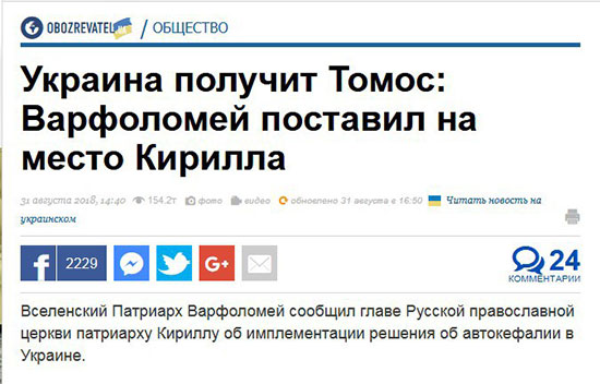Такође, украјински медији преносе да је аутокефалност православне цркве у Украјини готова ствар и да је Васељенски патријарх преломио у корист Украјинаца.