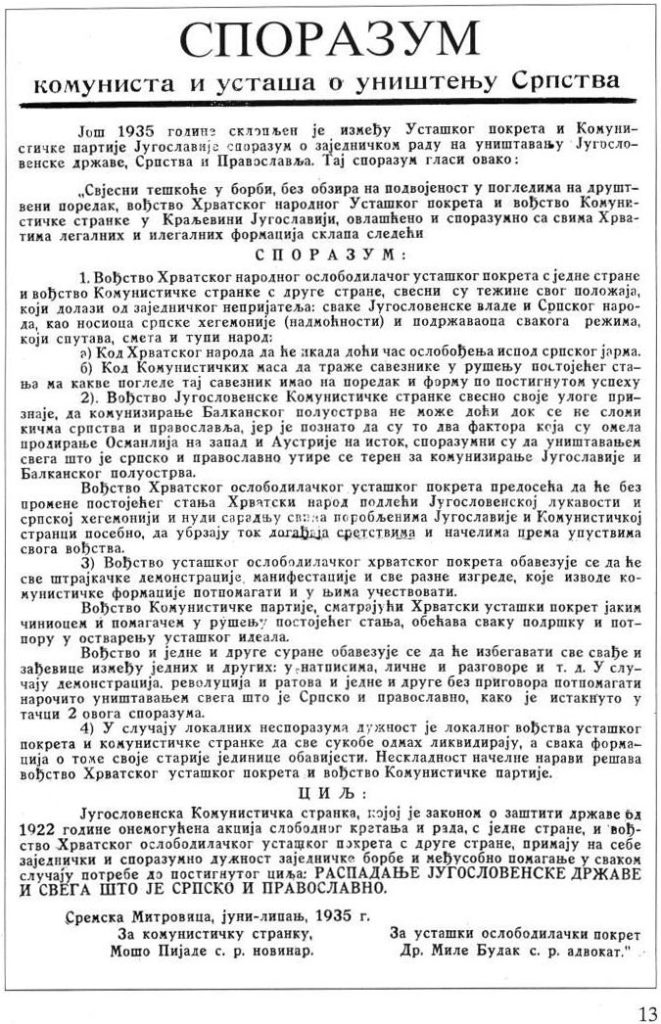 У антикомунистичкој публицистици посебно место имају тврдње да трагедија српског народа и Српске православне цркве започиње споразумом комуниста и усташа, склопљеног у затвору у Сремској Митровици 1935. године, потписници су били Моша Пијаде и Миле Будак.