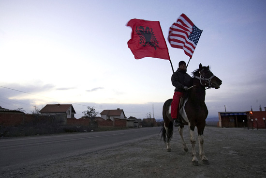 Косовски Албанац носи албанску и америчку заставу током прославе проглашења независности Косова, Приштина, 16. фебруар 2008. (Фото: Carsten Koall/Getty Images)