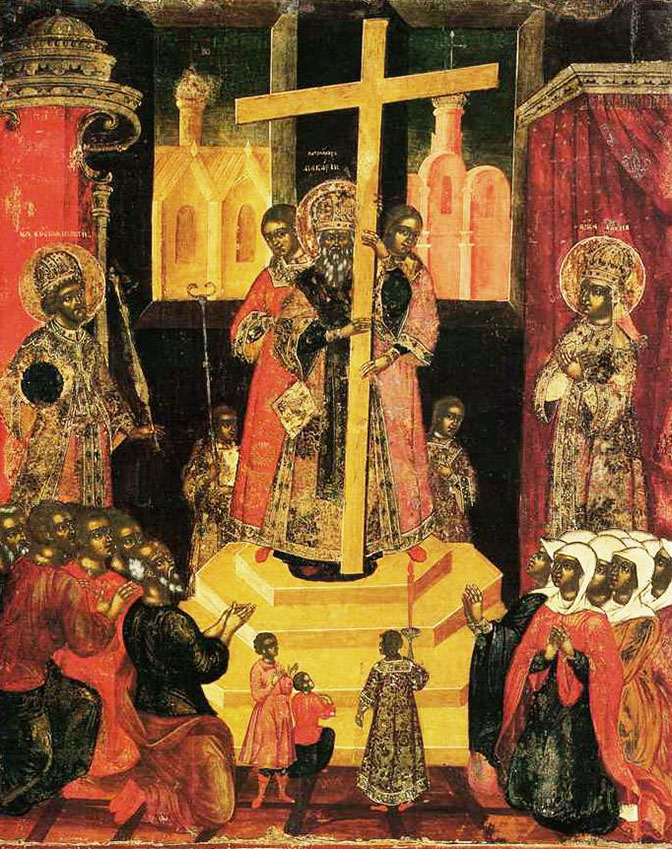 Народ се тиска да види пронађену светињу. Јерусалимски патријарх Макарије, ставши на узвишици, подиже Крст показујући га народу. А народ у глас виче уздизању Крста : Господе, помилуј!