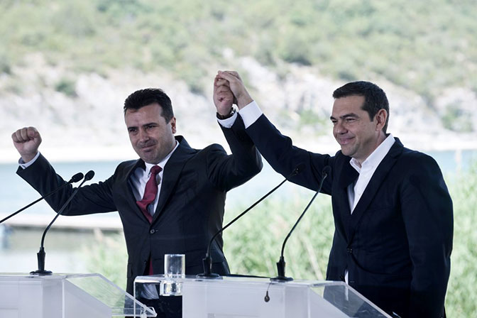 Македонски премијер Зоран Заев и његов грчки колега Алексис Ципрас, након што су потписали прелиминарни договор у јуну о промени македонског имена (Фото: Сакис Митролидис/Агенција Франс Прес)