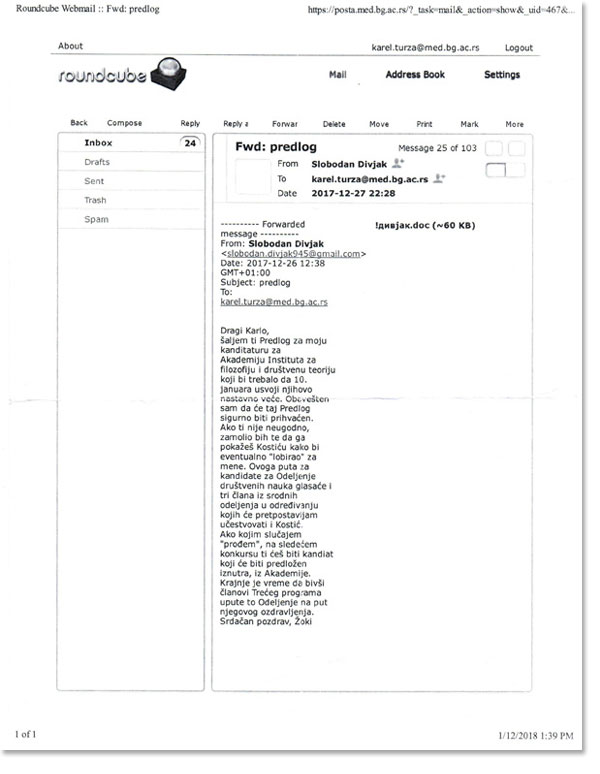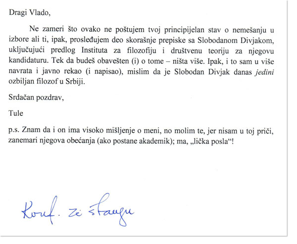 Пошто ме је последња реченица збунила (каква обећања?) прелистао са достављени материјал у коме се налазио и очито намерно остављени мејл господина Дивјака заједничком пријатељу: „Драги К, шаљем ти Предлог за моју кандидатуру за Академију Института за филозофију и друштвену науку који би требало да 10. јануара усвоји њихово Наставно веће. Обавештен сам да ће тај Предлог сигурно бити прихваћен. Ако ти није неугодно, замолио бих те да га покажеш Костићу како би евентуално „лобирао“ за мене. Овога пута за кандидате Одељења друштвених наука гласаће и три члана из сродних одељења у одређивању којих ће претпостављам учествовати и Костић. Ако којим случајем „прођем“, на следећем конкурсу ти ћеш бити кандидат који ће бити предложен изнутра, из Академије. Крајње је време да бивши чланови Трећег програма упуте то Одељење на пут његовог оздрављења. Срдачан поздрав, Жоки“.
