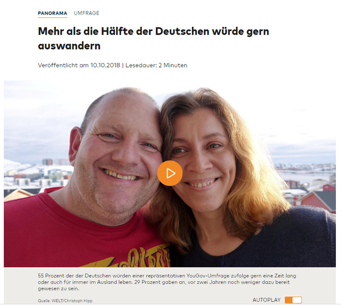 Скоро трећина анкетираних би радо, чак до краја свога живота, живела у иностранству. Тринаест процената би могло замислити свој живот ван Немачке у периоду од две до пет година. Девет процената би живело вани највише једну годину. Пре свега старији – преко 55 година – могу замислити да до краја живота живе у иностранству. Они у старосној доби од 18 до 24 године привучени су животу у иностранству, али на мањи број година.