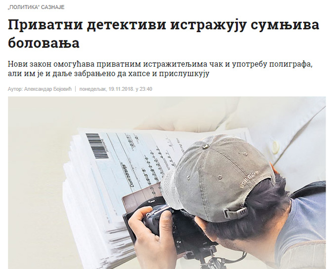 Па и у полицији је тако нешто ствар избора, чак се и не сматра доказом већ вероватноћом. Зашто се приватним детективима дозвољава употреба полиграфа? Када већ Политику, наше реномиране дневне новине, то не занима, већ некритички преносе само како ће послодавци имати још већу власт над модерним кметовима, да покушамо да разумемо ми. Измене и допуне Закона о детективској делатности предвиђају да ће приватни истражитељи моћи да проверавају биографије оних који се пријављују за посао и да проверавају њихова боловања. Дакле, компаније у Србији ће моћи од својих запослених и од оних који конкуришу за посао као услов за наставак рада или за добијање посла да захтевају подвргавање полиграфу. Моћи ће да вас питају шта год им падне на памет.