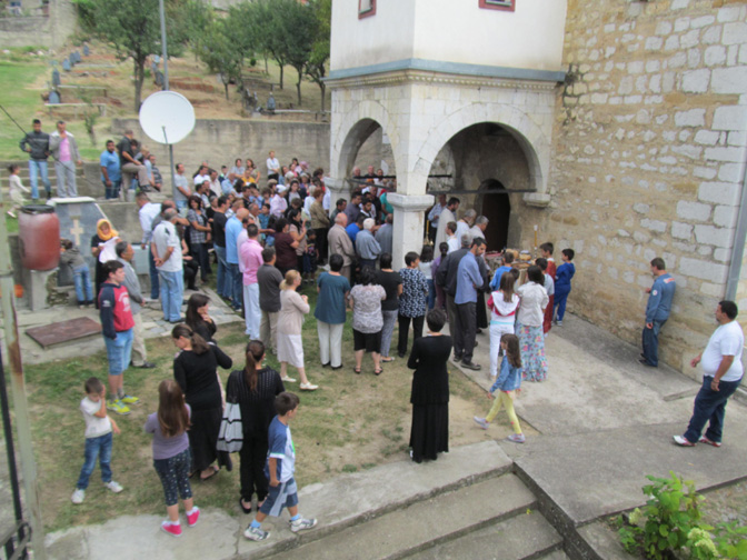 Срби испред Храма Успења Пресвете Богородице у Ораховцу (Извор: Између сна и јаве)